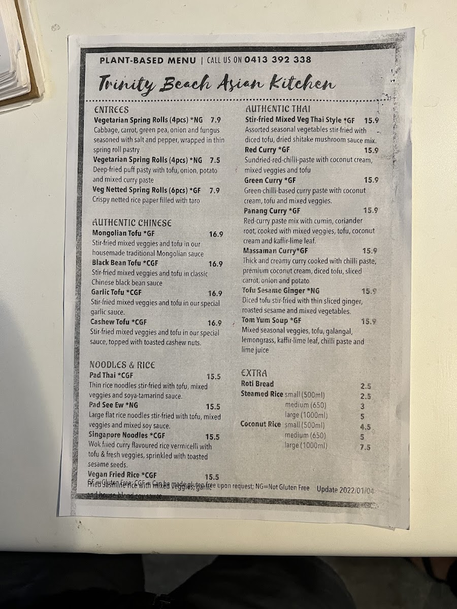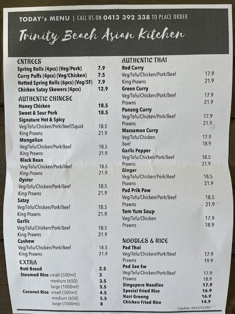 Trinity Beach Asian Kitchen offers a straightforward menu rooted in classic Asian and Chinese favorites, perfect for casual meals and quick takeaways. The menu balances comforting dishes like the Special Fried Rice and Sweet and Sour Pork with authentic Thai options such as Tom Yum Soup and a variety of curries, catering to both familiar tastes and those seeking a bit of spice.
